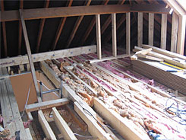 New 200mm by 50mm flooor joists have been fitted as per structural calculations, insulation is laid between joists. Floor board ready to be laid.