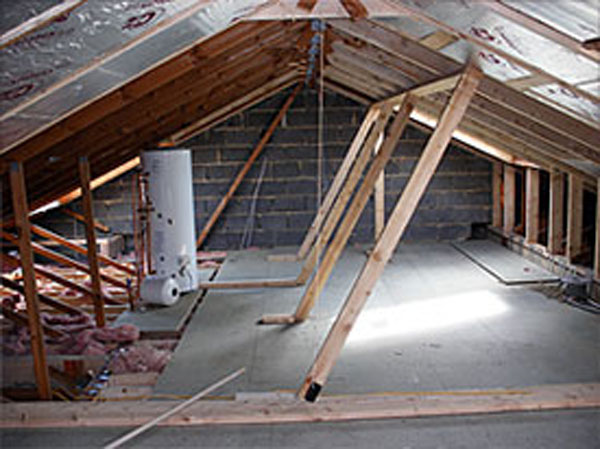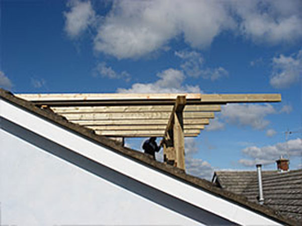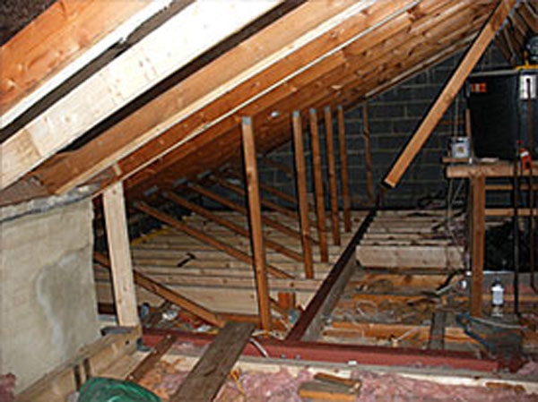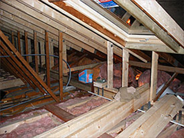 Flooring in progress with temporary supports to allow for the removal of trusses during construction of dormer.